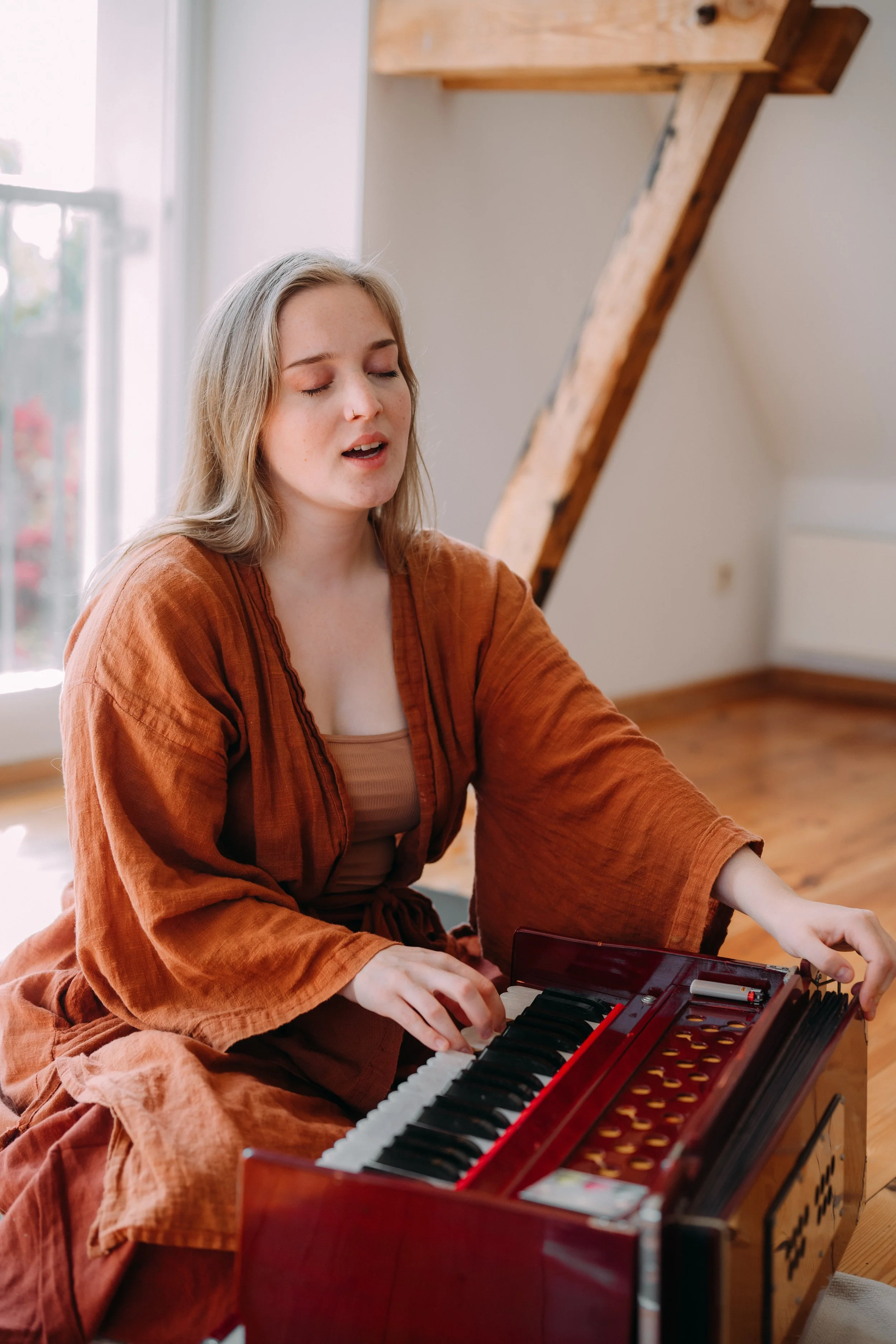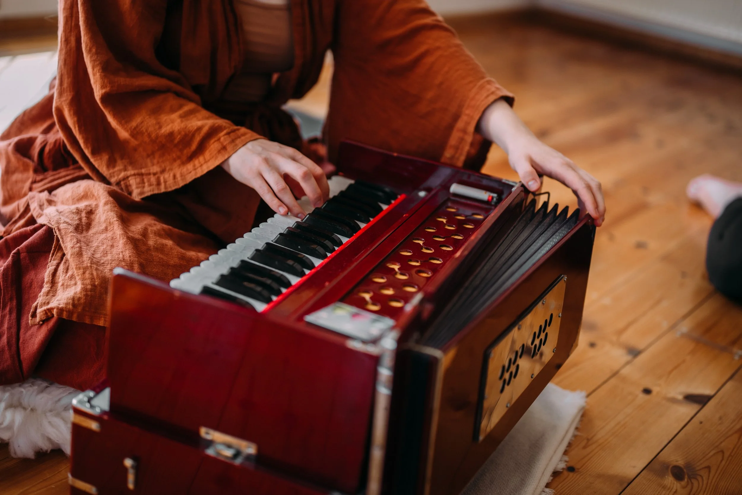 Learn to play the harmonium properly, sing mantras, and practice Bhakti for your personal development, workshops & yoga classes