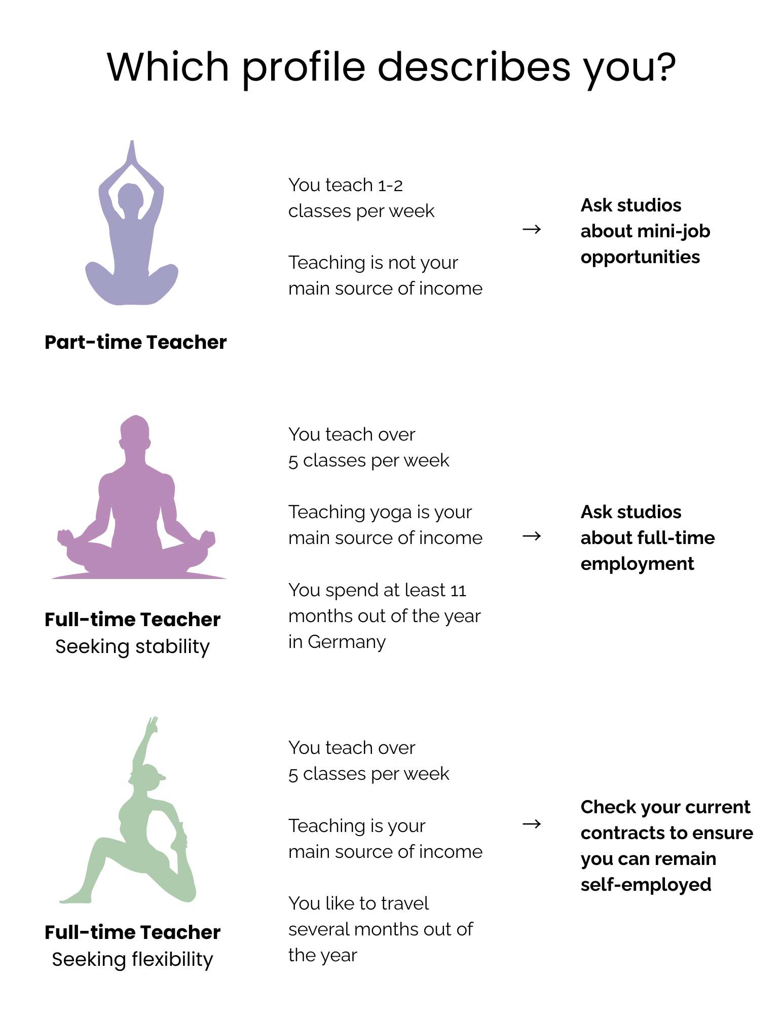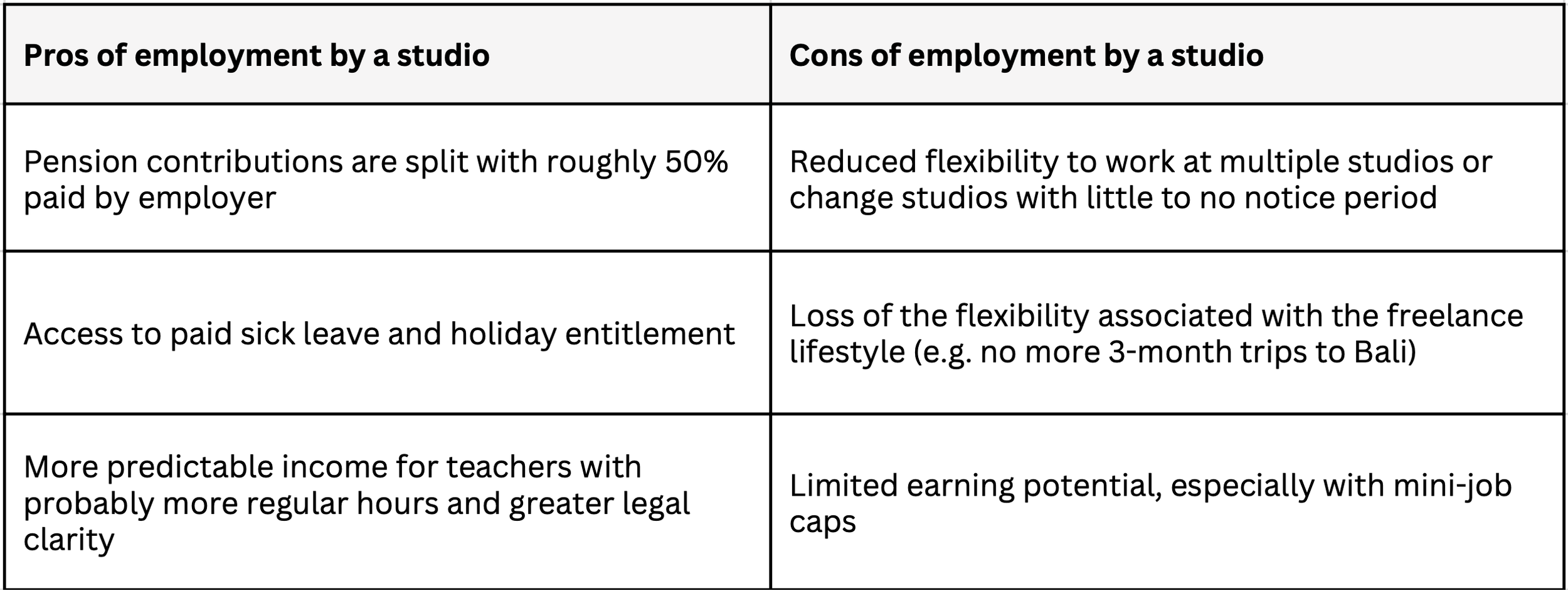 Teachers in the wellbeing industry work with multiple studios, schools or institutions. However, the teaching relationship with a studio may be classified as Scheinselbständigkeit if a teacher: