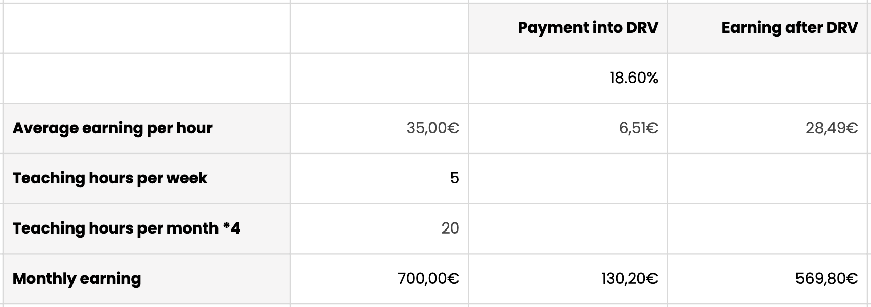 A teacher in Berlin might earn around 35€ per class. If a teacher gives five classes per week, this results in around 20 classes per month. At 35€ per class, the monthly income is 700€. Once the threshold of 603€ is crossed, pension insurance becomes mandatory. At a contribution rate of 18.6%, this means a monthly payment of 130,20€ to the statutory pension system. The remaining income is 569,80€.