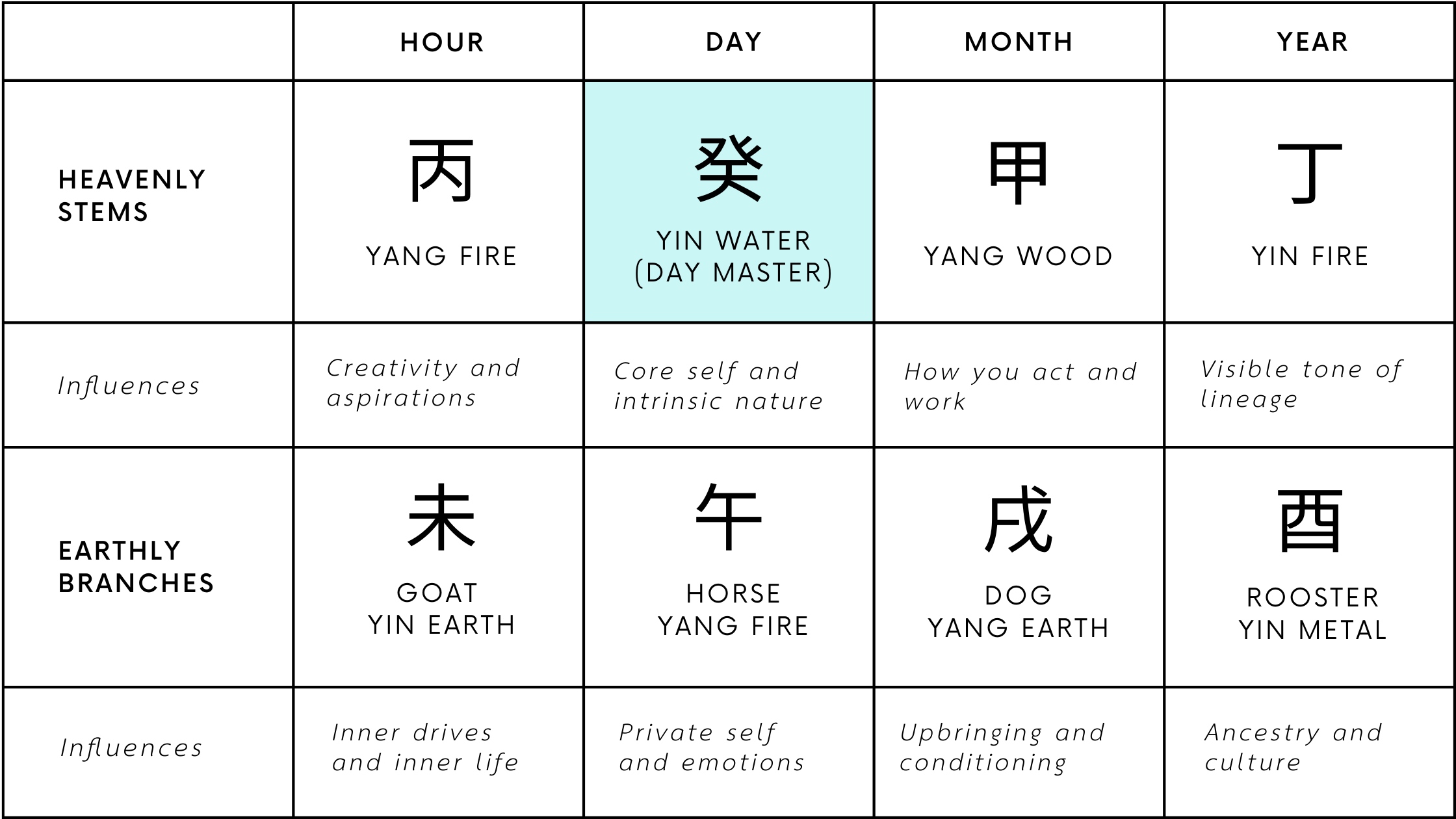 The Day Master is your core self – the you that exists beneath the social conditioning and familial expectations. When you read your chart from right to left, you are tracing a movement inward: from the external influences of ancestry and environment toward a deeper awareness of your own nature.