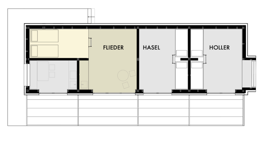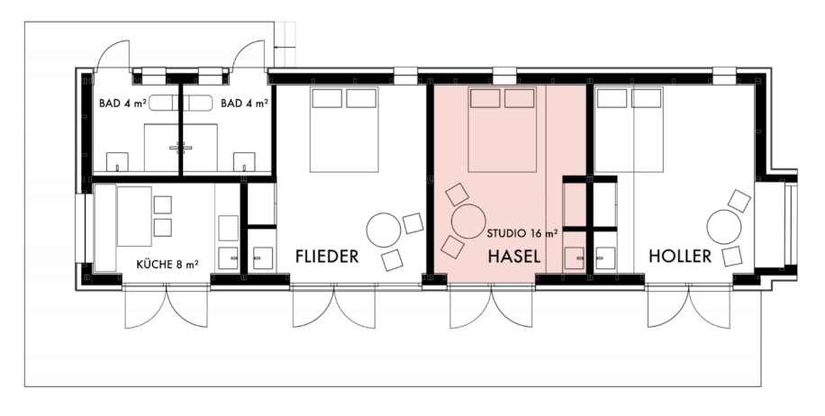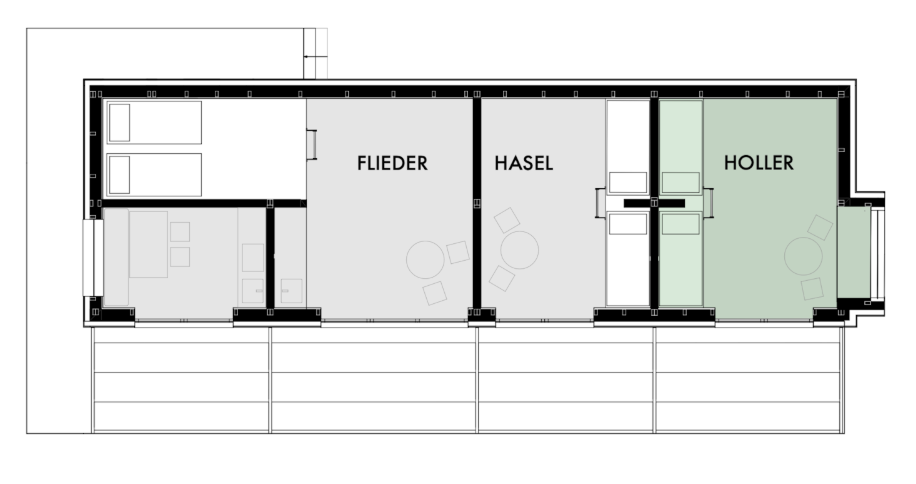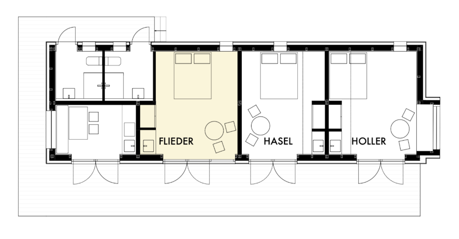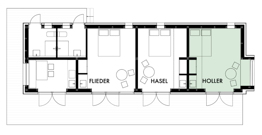 In the spacious garden of the complex stands a smaller wooden house with three simply furnished studios: Holler , Hasel, and Flieder. Each studio has a double bed, a sleeping loft, and a washbasin. Two bathrooms with showers and toilets and a kitchen are shared and accessible via the front terrace with pergola. The studios' floor-to-ceiling French doors can be fully opened to the outside, onto the terrace and the large garden with its willow grove.