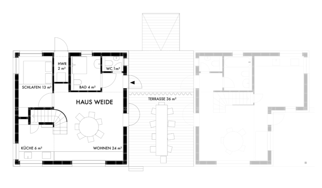 House Buche features a bright living and dining room with a very large window. The kitchen faces the village street. A covered terrace extends along the southeast side. A curved staircase leads from the living room to an open gallery with three sleeping alcoves and a separate bedroom overlooking the garden. An external gallery and the large terrace connect House Weide to House Buche when needed.