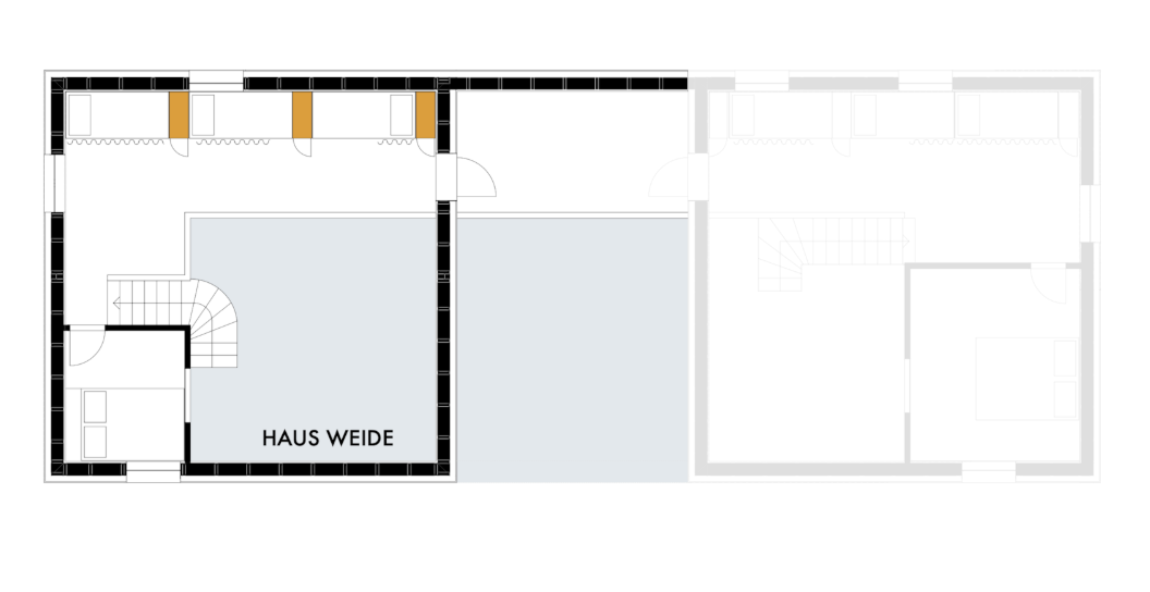 House Weide features a spacious eat-in kitchen with a large window seat. A curved staircase leads from the living area to an open gallery with three sleeping alcoves and a separate bedroom facing the garden. There is an additional accessible bedroom on the ground floor. An external gallery and the large terrace connect House Weide to House Buche when needed .