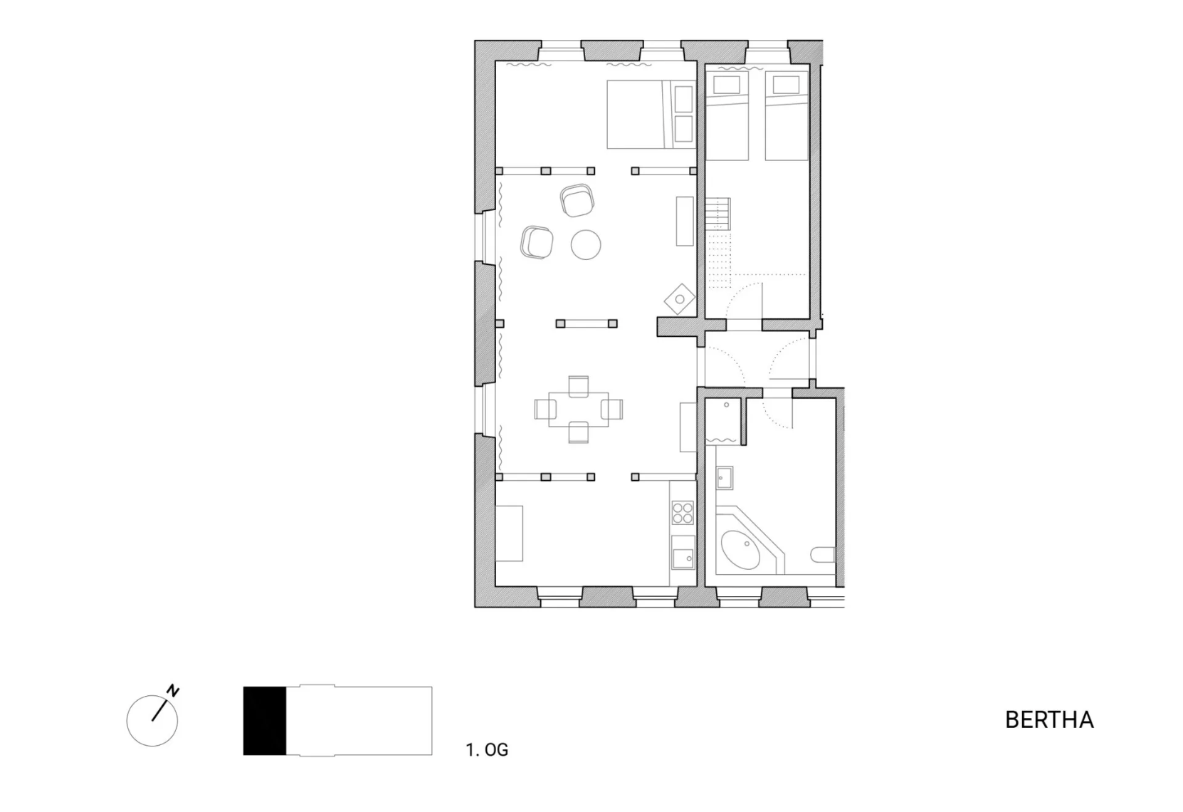 The approx. 60 m² large apartment is located on the top floor of the middle section of the house. The apartment features visible, whitewashed roof beams, many large skylights and six round ground-level windows on the gable sides lending a generous loft-like ambience. Enjoy the starry night skies thanks to the skylights (which also have shades). The loft has a kitchenette with a stove and dishwasher as well as a small bathroom with a small bathtub.