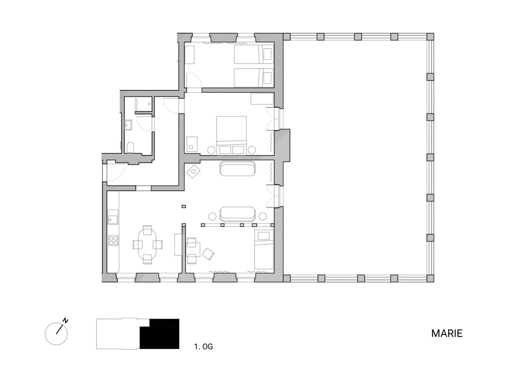 Marie is located on the first floor at the north-east gable of the manor house and has a large roof terrace. The 90 m² apartment consists of a spacious living area with open half-timbered elements. Adjoining it is a half-open kitchen a dishwasher and kitchen table. The 100 m² large roof terrace with dining area, deck chairs and wooden floor is accessible from the living room and bedroom. The bedroom with double bed leads into a smaller bedroom with two single beds.