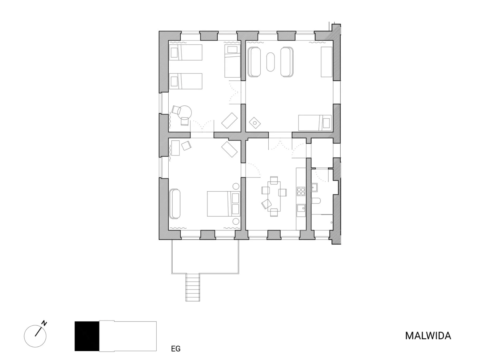 Malwida is a bright and sunny apartment in the “bel étage”. This 130 m² apartment is very spacious and stately. It consists of three approx. 30 m² large rooms which are connected by double doors. There is a chimney stove In the living room. The apartment has a well-equipped kitchen with dining table, gas stove, dishwasher and a bathroom with a large window. The 10.000 m² large manor house garden is directly accessible via a terrace.
